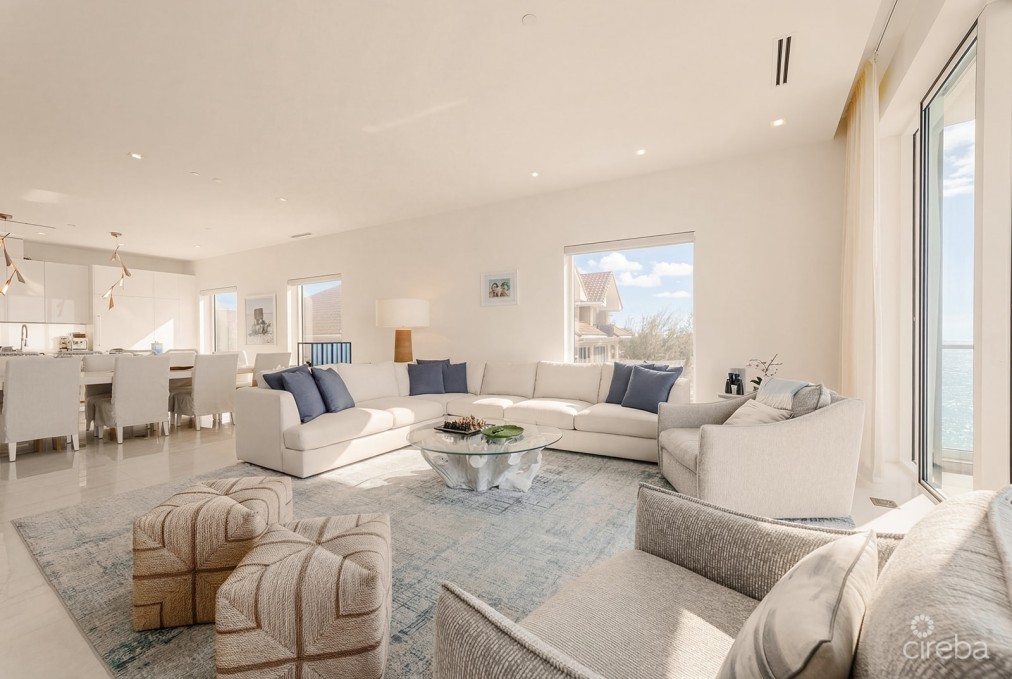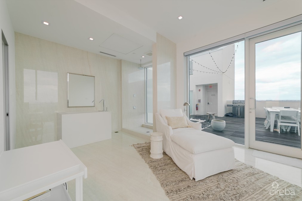 Luxury 4-Bed Oceanfront FIN Penthouse Perched atop the prestigious FIN development on South Church Street, Penthouse 29 is a striking three-level, 4,604-square-foot corner residence with incredible ocean views. Expertly furnished by Design Studio, this four-bedroom, four-and-a-half-bathroom home captures light through floor-to-ceiling windows and skylights, highlighting its marble flooring and modern finishes. A private elevator opens directly into the second floor, where two guest bedrooms with full baths, a reading nook, and a laundry room with oversized washer and dryer create a thoughtful and functional living space. Sonos speakers are installed throughout the residence, bringing high-quality sound to every room. Unique to this penthouse is a wrap-around terrace featuring a plunge pool, fire table, outdoor dining area with grill, and sweeping ocean views. As you descend the stairs, panoramic ocean views unfold, and a second balcony with a breakfast table and additional seating invites you to enjoy morning light or sunsets. The gourmet kitchen is outfitted with a Wolfe gas stovetop and microwave, Miele oven, Sub-Zero refrigerator, wine fridge, and integrated dishwasher. The master suite features a private balcony overlooking the ocean, his-and-her walk-in closets, and a spa-inspired water room with rain shower, bathtub, and Toto fully automatic toilet and bidet. The top cupola level contains an additional living room that can convert to a fourth bedroom, complete with a full bath and outdoor shower. Built in 2021, FIN offers private elevator access, 24-hour security, concierge services, a saltwater lagoon and pool, fitness center, spa and treatment room, business center, wine storage, underground parking, and a fleet of rentable Teslas. This penthouse also includes Lagoon Cabana #11 and on-site storage. Short- and long-term rentals are allowed, and the residence is pet-friendly. Located just south of George Town, FIN is situated alongside some of the island’s premier diving and snorkeling spots, including Sunset House and Eden Rock. Penthouse 29 is an exceptional opportunity to enjoy a luxurious oceanfront lifestyle while also serving as a high-end rental investment, combining breathtaking views, thoughtful design, and the best of Grand Cayman living.