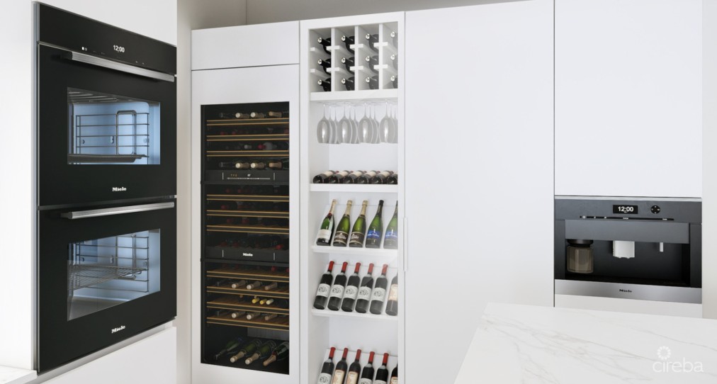 The gourmet kitchen stands as a masterpiece of functionality and aesthetic brilliance, appointed with a comprehensive suite of Miele appliances—from the integrated coffee machine to the convection and speed ovens—alongside an illuminated wine cabinet that transforms your collection into sculptural art.