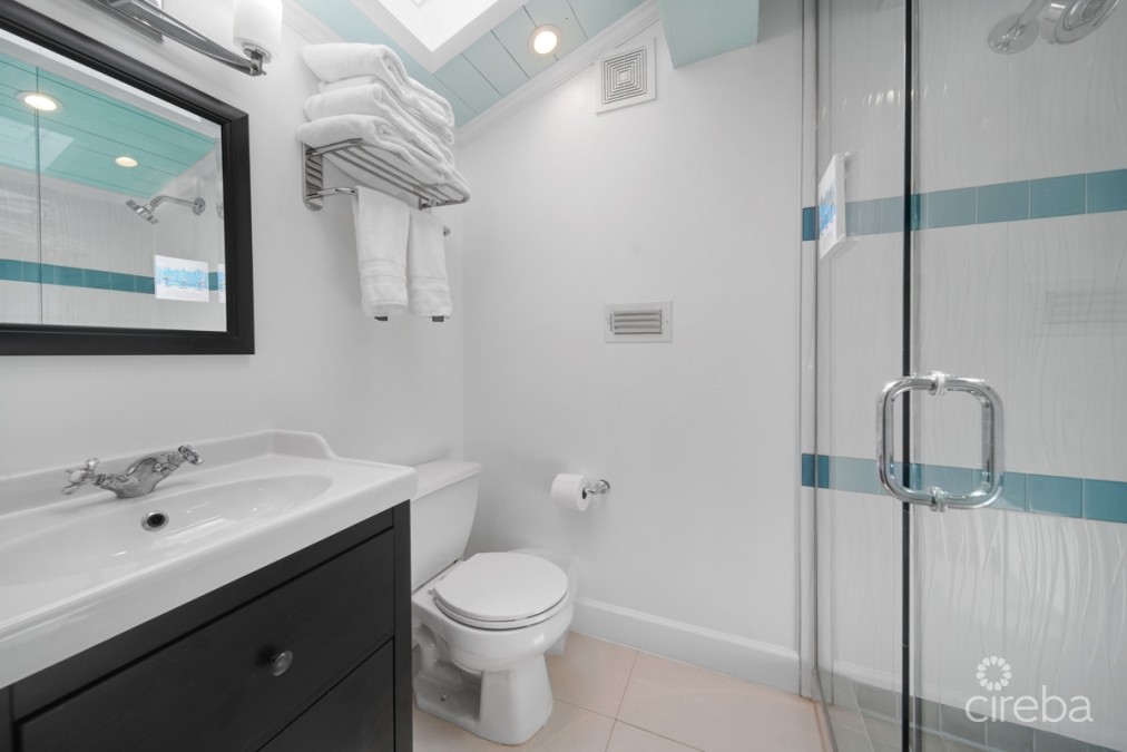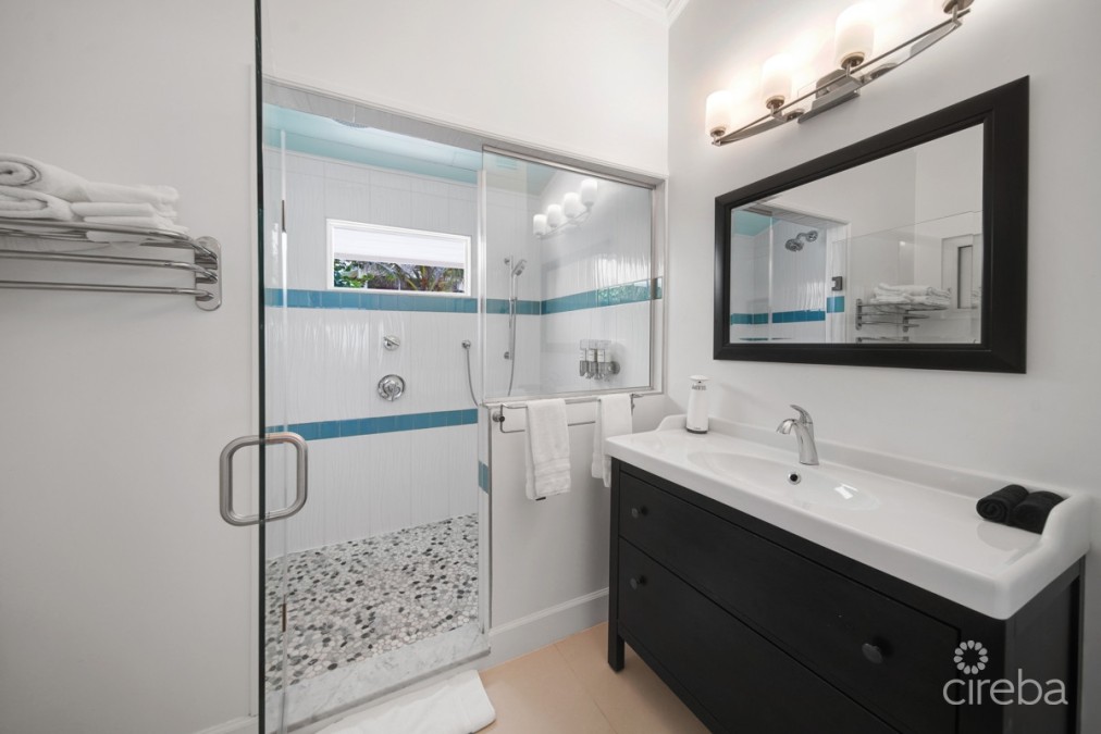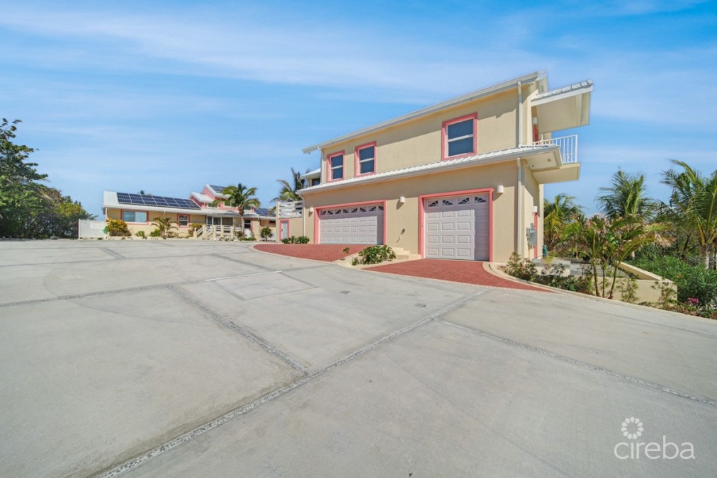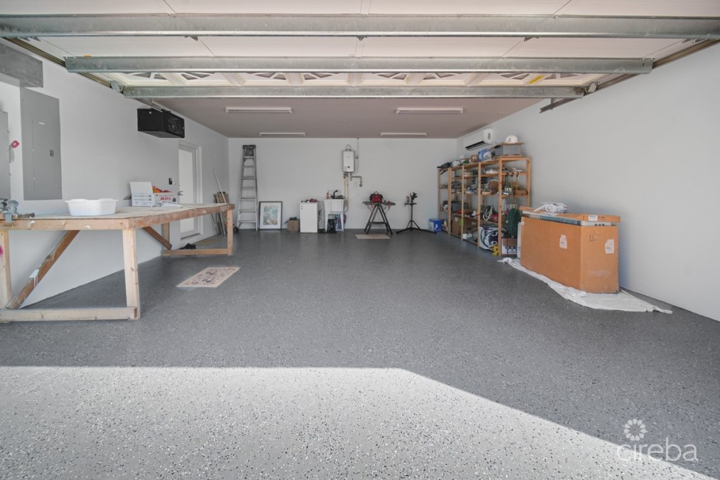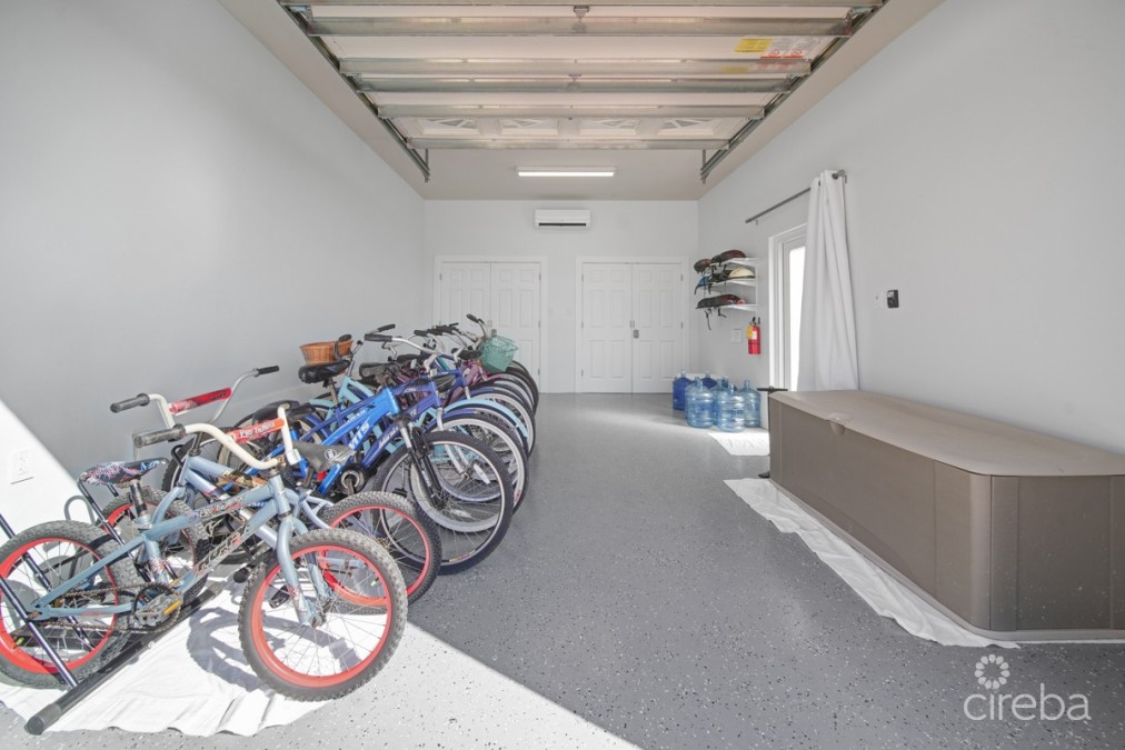 The new three-car detached garage offers independent climate control features and hurricane impact garage doors. Directly above the garage is a sophisticated apartment, gym or flex room showcasing Spanish tile work, independent air conditioning, and ceiling-integrated audio throughout the living room, bedroom, and screened patio. The South-facing balcony provides North Sound views with stunning sunset vistas.
