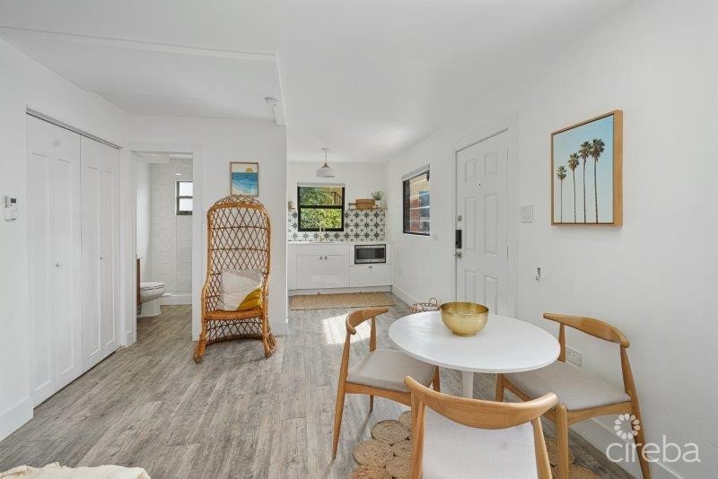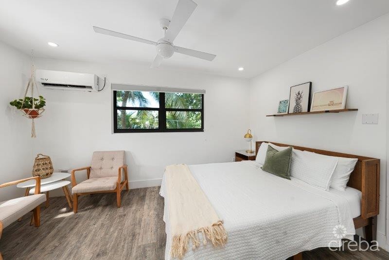 An true hidden gem in West Bay! This large studio was recently renovated and tastefully appointed with interior finishes and furniture in the popular Boho esthetic. Just cross the street and you are on Seven Mile Beach! A few steps further and you are at West Bay dock where you can catch the dive boats. This unit is a very profitable Airbnb with over 75% occupancy during high season! Agent Owned