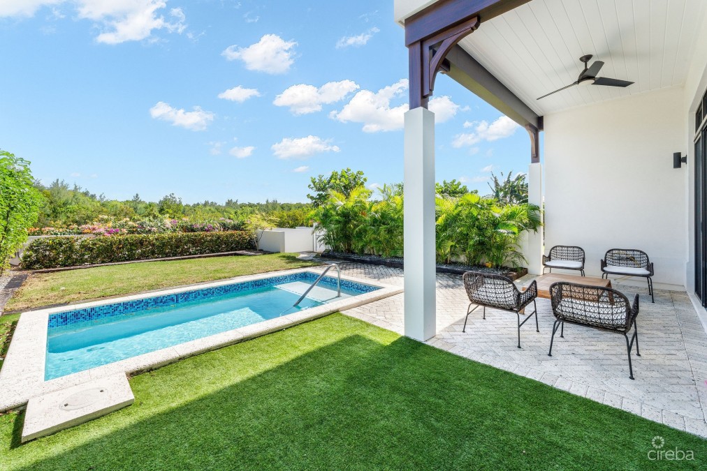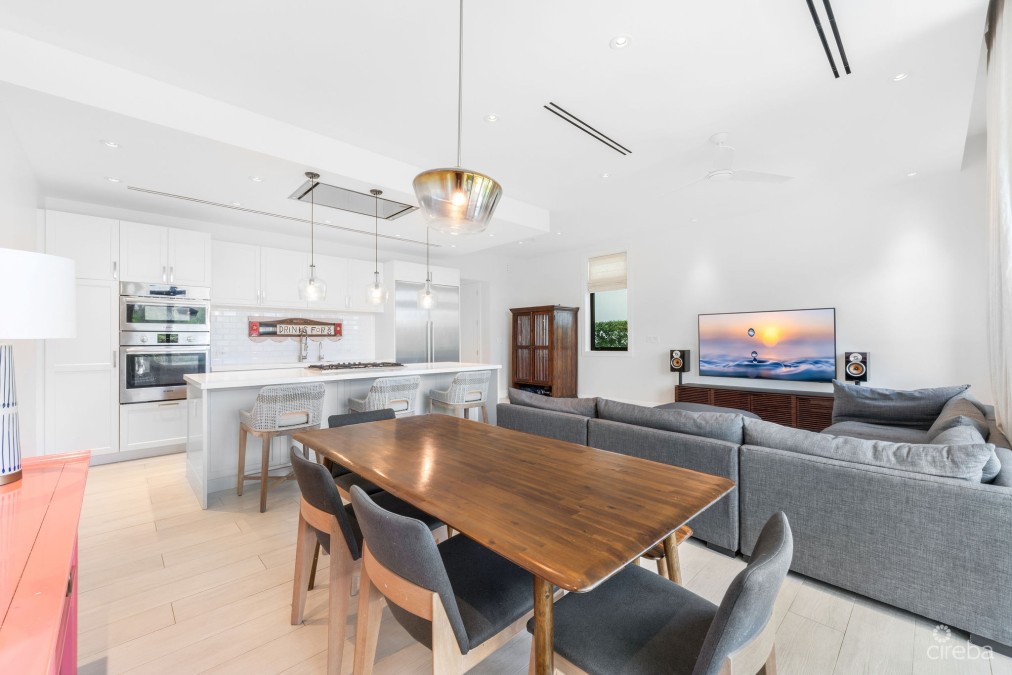 Olea Duplex 107 is a canal front residence located in the heart of the desirable community of Olea. Developed by NCB and Dart, this residence blends modern design with Caribbean charm. The 2,970 sqft home features an open-plan living and dining area, three bedrooms, and 3.5 bathrooms. The layout maximizes space and functionality with high ceilings and large patio doors leading to a private terrace and garden. The kitchen, perfect for entertaining, includes an oversized island, breakfast bar seating, Bosch appliances, quartz countertops, and custom cabinetry. Step outside to your private pool and garden area where you can spend the perfect weekend entertaining friends & family. Upstairs, each of the three well-proportioned bedrooms has its own ensuite bathroom, along with a large laundry room. The master suite has a balcony, perfect for morning coffee with the north sound breezes, overlooking the canal. Olea offers resort-style amenities such as a tropical swimming pool with a lazy river, fitness center, herb garden, yoga space, and communal BBQ area. This sustainable development includes geothermal cooling, solar panels, and electric car charging stations to minimize its carbon footprint. Conveniently located near the Camana Bay Town center, Olea 107 provides easy access to the island's central hub for shopping, dining, entertainment, fitness facilities, and health & wellness. The new Health City facility is nearby, offering state-of-the-art medical care. The community is walkable and connected, just a 10-minute walk from Seven Mile Beach and a short stroll from all of Camana Bay's attractions. This is the real difference.