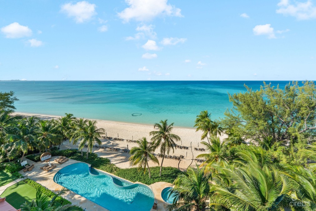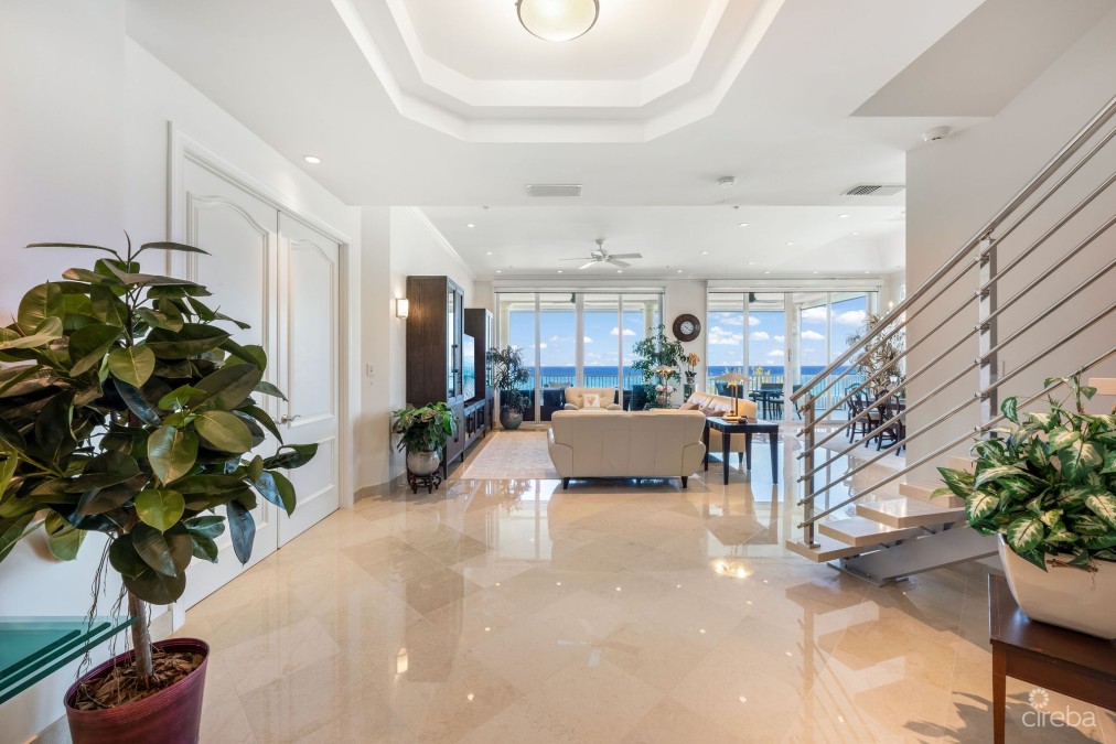 Renaissance #38 is one of only three true penthouses in this prestigious low-density development, making it among the most exclusive and desirable residences on all of Seven Mile Beach. Spanning 5,300 sq. ft. across two levels on the 7th floor, it offers commanding, unobstructed ocean views and an exceptional sense of privacy, volume, and space rarely available on SMB today. A wraparound terrace with screened areas enhances year-round indoor–outdoor living. Multiple bedroom suites enjoy stunning panoramic ocean views, while the standout feature is a superb 800+ sq. ft. private upper-level guest suite with its own living area, theatre-style lounge, kitchenette, study, bedroom, and bath—ideal for long-stay guests or multigenerational living. Set within a boutique community of just 37 residences, The Renaissance offers premium amenities: an 85 ft. beachfront infinity pool with heated Jacuzzi, fitness centre, billiards room, beach BBQ, backup generator, onsite office, and beautifully landscaped grounds along 200 ft. of quiet, pristine beach next to the Seafire Resort & Spa. A secure, enclosed private two car garage with its own doors further elevates the offering—an increasingly rare feature on Seven Mile Beach. With significantly greater square footage, privacy, and flexibility than comparably priced beachfront properties, Penthouse #38 delivers standout value and a truly rare ownership opportunity on Cayman’s premier coastline.