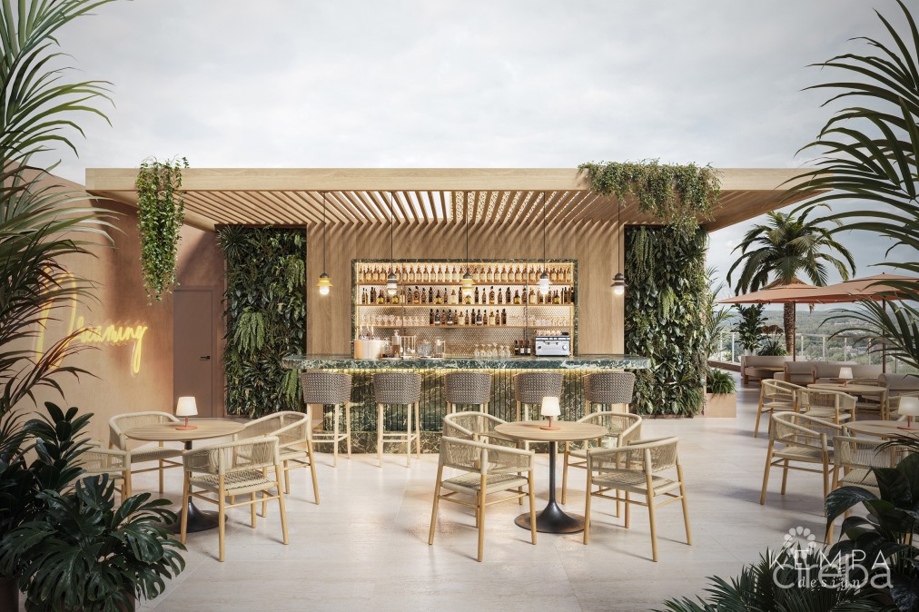 Unit #53 at The Grove Too is a modern residence within a boutique mixed-use development located just off Seven Mile Beach. The Grove Too features 68 one-, two-, and three-bedroom apartments set above Class-A commercial space and arranged around a landscaped central courtyard designed by Enea Garden Design. This residence offers an open-plan layout with a fully equipped kitchen, in-unit laundry, oak wood flooring, custom German cabinetry, solid brass fixtures, electronic locks, and an oversized balcony overlooking the courtyard. Assigned covered parking is included, with secure key-card access, elevators, and 24-hour manned security with CCTV. Residents enjoy exclusive access to a rooftop terrace with resort-style pool and hot tub, sauna and steam rooms, meditation garden, daybeds, children’s areas, and a bar with limited food service. Partial views of the Caribbean Sea and North Sound are available from the rooftop. The building is constructed above Miami-Dade hurricane standards with reinforced concrete structure, impact-rated windows and doors, energy-efficient air-conditioning, and an elevated base level. A fully serviced rental program and furniture package are available.