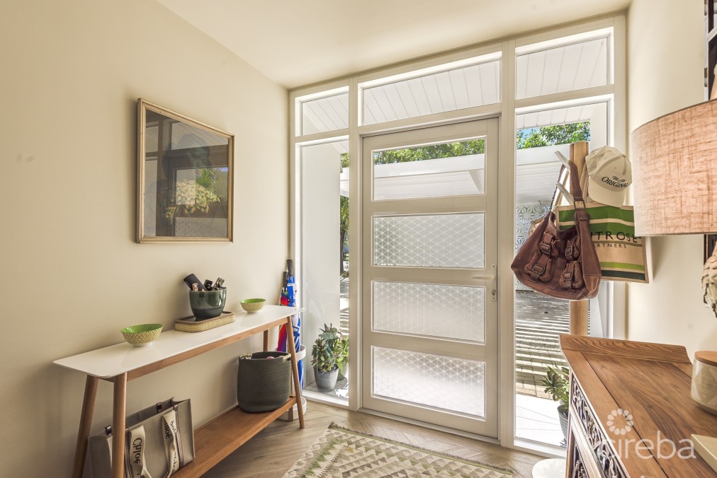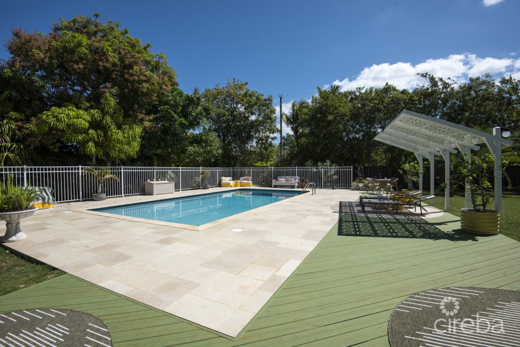 Solidly built high and dry on a double lot, this family-sized home now comprises of 4 bedrooms and 3.5 bathrooms over 2.5 stories and is move-in ready for you and your family to grow, spending more time enjoying the spaces inside and out, less time commuting In keeping with the original residence, this is a thoughtful and enduring renovation defined by classic clean lines, organic materials, and a focus on functionality over fussy ornamentation. The front door is concealed from the road, approached from the port-cochere with privacy screen over a carriage driveway. Entering the hallway which opens onto the custom kitchen and dining room, with an island in between and wine bar making evening entertaining a dream and starting the day at the built-in coffee station. Double doors lead to the living room with a voluminous pitched ceiling, sitting area, custom shelving and desk. The laundry backs onto the utility and guest powder room, connecting the kitchen and back patio door. There is also a study/den that has patio access. On the mezzanine level a second/large dual aspect bedroom stuite, also with voluminous pitched cielings above that are continued into the bathroom. Your own sanctuary awaits in the south facing primary suite complete with a remodelled bathroom with a walk-in jetted and rain shower system, double vanity, free standing tub to luxuriate in, separate toilet and dual walk-in wardrobes. Third and forth queen size bedroom suites, both of which have their own closets and share a bathroom Depending on the time of day, there is always either sun or shade to be appreciated outside. Serviced by well irrigation and separated into three parts: The large saltwater pool, deck and lawn surrounded by trees, and extra poolside shade is provided by a pergola. Grill on the brick paved back patio featuring a gas barbecue point, sliding pass through window to the kitchen, and another gate to the side space ideal for overflow parking for a cars/boat trailer. The property has been thoroughly and tastefully renovated by the broker for a turnkey offering, included but not limited to the following: • Insulated Standing seam roof • Impact rated doors & windows • Contemporary kitchen with KitchenAid appliance package, quartzite counters • Marble topped Wine bar & coffee station with • Italian parquet-style porcelain tiles • 2 New high efficiency AC systems • Gas hot water heater, cooktop, dryer and barbecue point • Fully fenced garden with tropical landscaping & mature fruit tree’s • UV protecting cover to the side porch