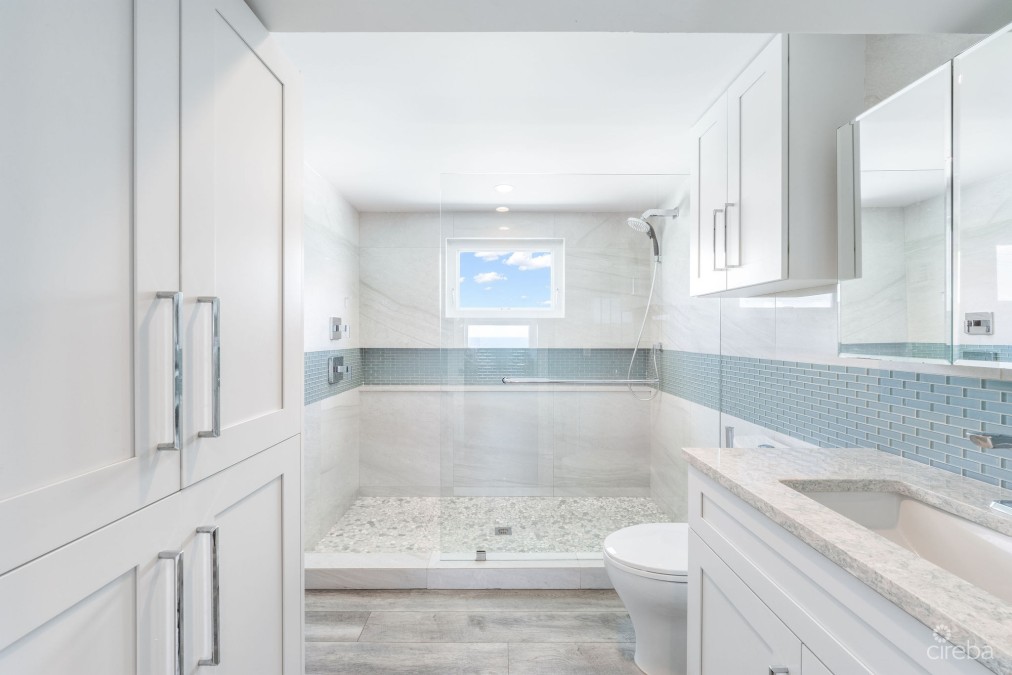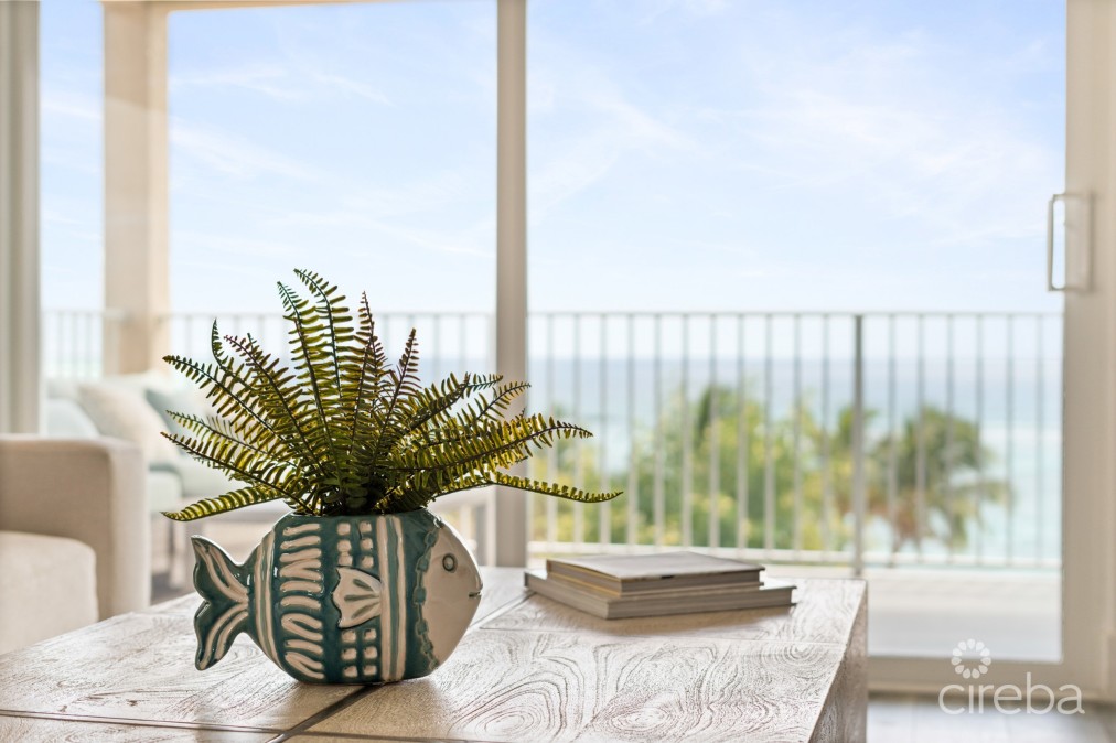 Introducing this meticulously renovated, one-of-a-kind 4 bedroom, 3 bathroom condominium, built as the builder's personal residence. Located on the shores of Cayman's iconic Spotts Beach - a sanctuary for resident sea turtles, shady palms, and powdery white sand - this property offers a luxurious coastal living experience like no other. This Penthouse level home boasts sweeping ocean vistas in a captivating palette of blues, greens and aquas, ensuring breathtaking views from virtually every room. From the moment you enter, the panoramic ocean views and expansive white modern cabinetry immediately capture your gaze. Designed with both comfort and functionality in mind, this home features an abundance of smart built-in storage solutions. Custom Murphy Door closet systems maximize space, incorporating built-in shoe storage, laundry hampers, and well organized shelves hidden behind mirrored panels. A true showstopper, the full glass display and LED-lit entertainment bar, paired with two under cabinet beverage centers, elevates the space - perfect for hosting guests or unwinding in style. The spacious kitchen is a chef's dream, centered around a massive full-slab island that serves both as a stunning focal point and a functional workspace. With a premium appliance package that includes a built-in microwave and wall oven, this kitchen is designed to inspire culinary creativity. Each of the three beautifully appointed bathrooms showcases exceptional craftsmanship, featuring decorator-tiled walk-in showers with barn door glass enclosures, creating a serene spa-like ambiance. The primary bath includes a spacious vanity for everyday essentials, complemented by diffused under cabinet lighting, six foot long mirrored medicine cabinet storage, and an entire wall of custom white-gloss built-in storage cabinets, offering ample, thoughtfully designed space. The generously sized bedrooms are serene retreats, with custom built-ins and a primary suite that captures ocean views, allowing the beauty of the sea to be enjoyed from the comfort of your bed. Another highlight of the condo is the charming ocean-view games room, which doubles as a cozy retreat with a queen-size sleeper sofa to comfortably accommodate additional guests. Step outside onto the large elevated 294 square foot rear open lanai, where you can dine al fresco with a six-seat table, enjoy the tranquil ocean breeze, or unwind in the ample seating areas. Perfect for entertaining, lounging, or relaxing with loved ones, the lanai offers a true extension of your living space. This exceptional condominium perfectly blends modern luxury, functionality, and unparalleled views - all wrapped in a sleek contemporary design. Ideally suited as both a sought-after luxury vacation rental or as a spectacular resident family beach home. Schedule your private showing today! *Strata fees include water and Logic package