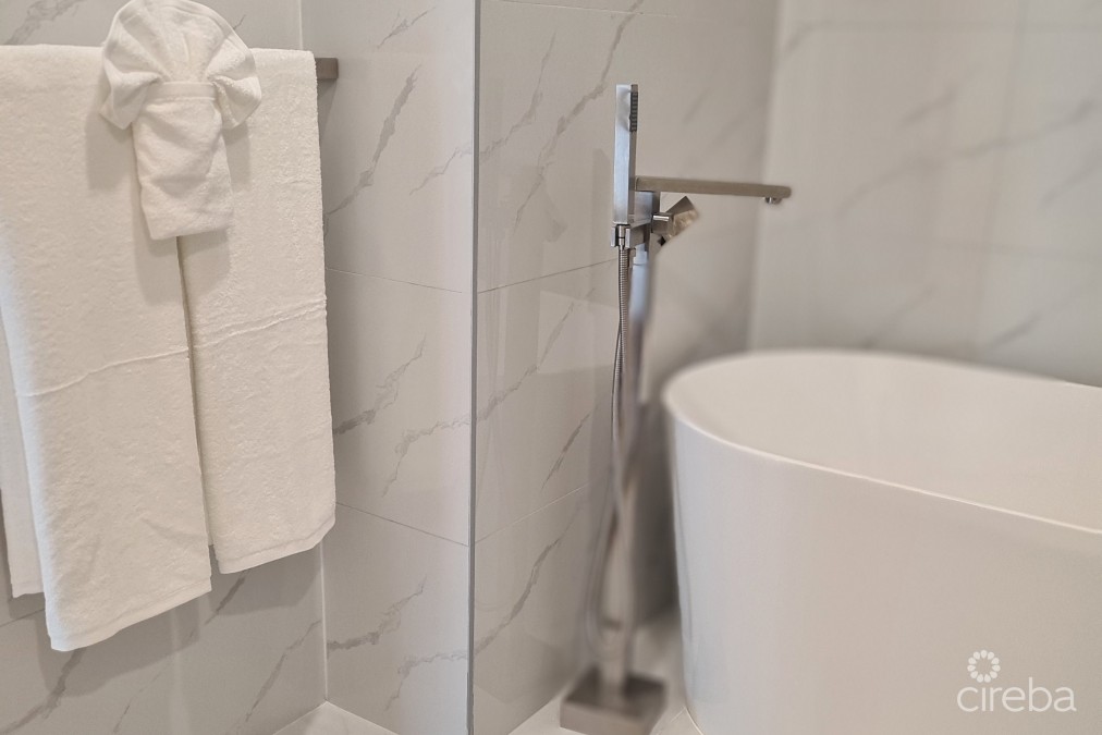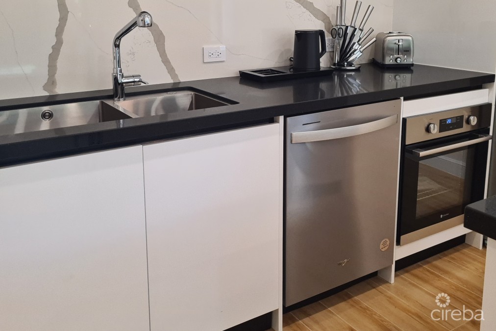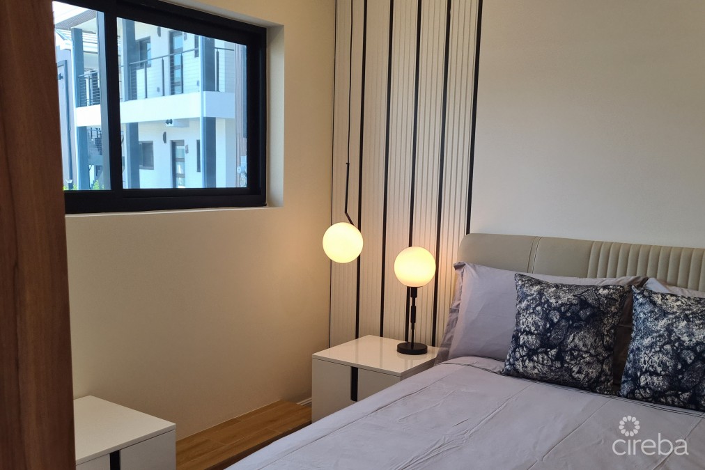 Welcome to one of West Bay's newest communities-ARZA, a thoughtfully planned development designed with comfort and style in mind. This two-bedroom, two-bathroom condo offers bright, open living space perfect for relaxing or hosting friends and family. As a ground-floor end unit, this home is filled with natural light and features a spacious, double-sized private patio accessed through both the living room and the primary bedroom. Inside, you’ll find a smart open-plan layout with nine-foot ceilings, acoustically insulated walls, hurricane-rated impact windows, and designer lighting. The kitchen stands out with its large island, extended cabinetry, and high-end appliances-ideal for everyday living. The primary bedroom features a walk-through wardrobe and direct access to the patio. The bathrooms include sleek porcelain tile finishes throughout for a clean, modern look. As an added bonus, upgraded finishes come standard with this unit-no extra cost. Living at ARZA means access to a range of shared amenities. Enjoy a stunning 50-foot pool, fitness center, and a rooftop lounge with beautiful views, offering the perfect space to unwind. Just a short drive away are local highlights like West Bay Public Beach, Seven Mile Beach, and Barkers National Park-whether you're into beach days or scenic walks, it’s all easily accessible. Whether as your personal residence or income generator, this home is a great fit for those seeking modern convenience, quality construction, and a prime location on the island. Reach out today to schedule your viewing!