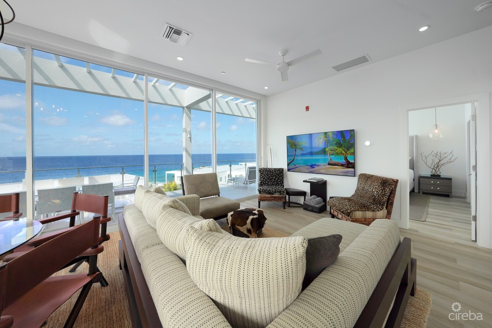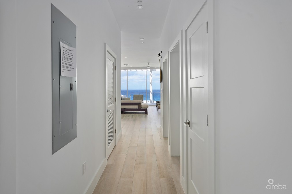 Upscale Luxury Signature Penthouse Corner residence ideally located in Northwest Point, West Bay - one of Grand Cayman's most desirable and tranquil waterfront enclaves offering pristine diving sites with natural inlet entry. Lushly landscaped 3.5 acres with 460ft crystal blue sea frontage offers resort-style living with exceptional privacy and amazing sunset views. Featuring nearly 1900 sq ft of open-concept living space with high ceilings. Floor-to-ceiling glass doors open to a 35-foot Penthouse Terrace with uninterrupted sea and sunset views from both the main living and primary suite. Wake up to endless Sea horizons, world-class snorkelling, renowned diving and breathtaking Sunsets while being just minutes from Seven Mile Beach, Camana Bay and top dining restaurants. Walking distance to Cayman's Turtle Centre and Dolphin Discovery. Next door to Cracked Conch Restaurant and Macabuca Tiki Bar. The interior has been carefully curated with high-end finishes, designer furnishings and upgrades to embrace indoor-outdoor living and the relaxed elegance of the Caribbean lifestyle. Residents enjoy a fully equipped gym with Sea View, Serene Pool and a large heated jacuzzi. Sea views from an inviting Gazebo with a wet bar, grille, fridge, sofas and a pool table. Positioned in a peaceful yet highly accessible area offering lifestyle appeal and investment opportunity with strong rental income and optional concierge-style management.